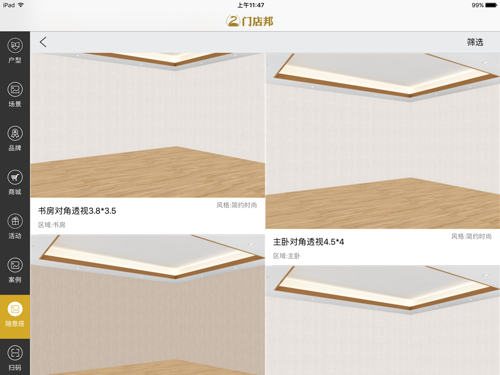 根据您想要的品牌产品,随心搭配出时尚潮流的3D生活式场景,让您享受到专业设计的方案,同时,您也可以通过我们的搭配DIY系统,方便快捷的进行局部的调整,选到合适自己的家。您也能在移动APP上进行操作,通过几步简单的点击操作,便能呈现完全不同的生活方式场景。